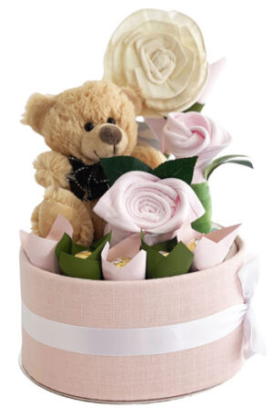 Baby gifts that will be remembered. This gorgeous and high quality nappy gift cake featuring adorable plush baby bear, designer muslin wrap, matching essential designer baby bodysuit and bib, delicious ferrero rochers and much more will melt hearts!